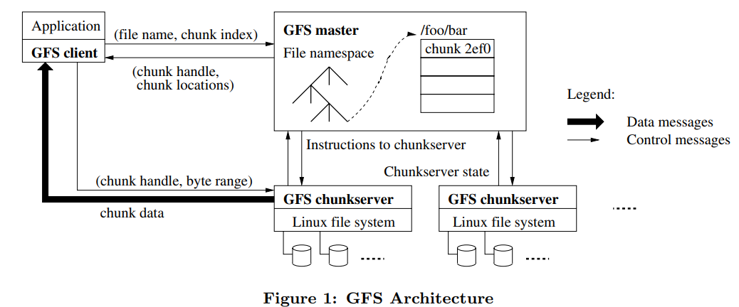 一个 GFS 集群包含一个单独的 Master 节点、多台 Chunk 服务器,并且同时被多个客户端访问,如图 1 所示。所有的这些机器通常都是普通的 Linux 机器,运行着用户级别(user-level)的服务进程。我们可以很容易的把 Chunk 服务器和客户端都放在同一台机器上,前提是机器资源允许,并且我们能够接受不可靠的应用程序代码带来的稳定性降低的风险。