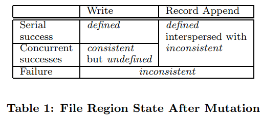 当一个数据修改操作成功执行,并且没有受到同时执行的其它写入操作的干扰,那么影响的 region 就是 已定义的(隐含了一致性):所有的客户端都可以看到写入的内容。在文件相同偏移量处的并行修改操作成功完成之后,region 处于一致的、未定义的状态:所有的客户端看到同样的数据,但是无法读到任何一次写入操作写入的数据(第 3.1 节末尾有解释)。通常情况下,文件 region 内包含了来自多个修改操作的、混杂的数据片段。失败的修改操作导致一个 region 处于不一致状态(同时也是未定义的):不同的客户在不同的时间会看到不同的数据。后面我们将描述应用如何区分已定义和未定义的 region。应用程序没有必要再去细分未定义 region 的不同类型。