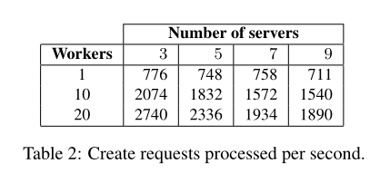 为了评估请求的延迟,我们创建了一个基于Chubby基准测试[6]的基准测试。我们创建了一个工作进程,它只是发送一个创建请求,等待它完成,发送一个异步删除新节点的请求,然后开始下一个创建请求。我们相应地改变工作进程的数量,对于每次运行,我们让每个工作进程创建50,000个节点。我们通过将完成的创建请求的数量除以所有工作进程完成所需的总时间来计算吞吐量。