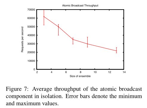 原子广播协议完成了系统的大部分工作,因此限制了ZooKeeper的性能,比其他任何组件都要多。图7显示了原子广播组件的吞吐量。为了对其性能进行基准测试,我们通过在领导者处直接生成事务来模拟客户端,因此没有客户端连接或客户端请求和回复。在最大吞吐量下,原子广播组件变得受CPU限制。理论上,图7的性能将与100%写入的ZooKeeper性能相匹配。然而,ZooKeeper客户端通信、ACL检查和请求到事务转换都需要CPU。争用CPU使ZooKeeper的吞吐量远低于原子广播组件在隔离状态下的吞吐量。因为ZooKeeper是一个关键的生产组件,所以到目前为止,我们对ZooKeeper的开发重点一直是正确性和稳健性。通过消除额外的副本、同一对象的多次序列化、更高效的内部数据结构等,有很多机会可以显著提高性能。