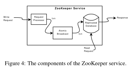 ZooKeeper通过在组成服务的每台服务器上复制ZooKeeper数据来提供高可用性。我们假设服务器发生崩溃故障,这些故障的服务器可能会在之后恢复。图4显示了ZooKeeper服务的高级组件。在接收到请求后,服务器会准备执行该请求(请求处理器)。如果该请求需要在服务器之间进行协调(写入请求),则它们会使用协议达成一致(原子广播的实现),最终服务器会将更改提交到ZooKeeper数据库,该数据库在整个服务器集合中进行完全复制。对于读取请求,服务器只需读取本地数据库的状态并生成响应。