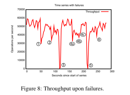 要展示随着故障注入而系统行为随时间变化,我们运行了一个由5台机器组成的ZooKeeper服务。我们运行了与之前相同的饱和基准测试,但这次我们将写入百分比保持在恒定的30%,这是我们预期工作负载的保守比例。我们定期杀死了一些服务器进程。图8显示了系统吞吐量随时间变化。图中标记的事件如下: