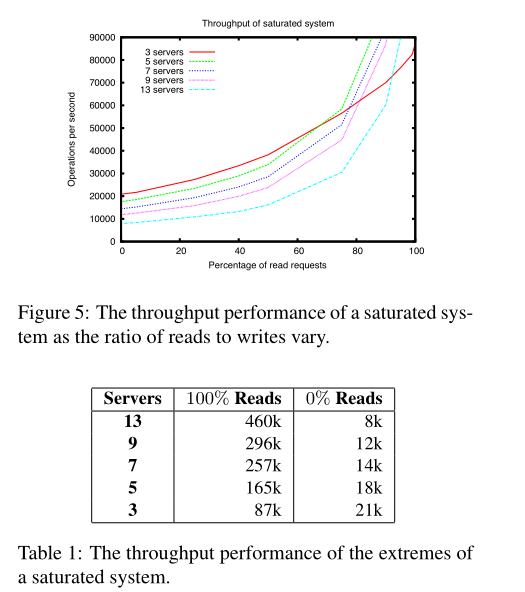 在图5中,我们展示了吞吐量随着读写请求比例的变化,每条曲线对应于提供ZooKeeper服务的不同数量的服务器。表1显示了读负载极值处的数字。读取吞吐量高于写入吞吐量,因为读取不使用原子广播。图中还显示,服务器数量对广播协议性能也有负面影响。从这些图中,我们观察到系统中服务器的数量不仅影响服务可以处理的故障数量,还影响服务可以处理的工作负载。请注意,三个服务器的曲线在60%左右与其他曲线相交。这种情况并非仅限于三服务器配置,由于本地读取启用的并行性,所有配置都会发生这种情况。然而,在图中其他配置中并未观察到这一点,因为我们已经将最大y轴吞吐量限制在可读范围内。