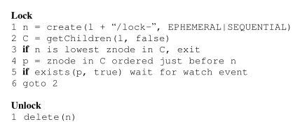 释放锁和删除表示锁请求的 znode 节点。通过在创建时使用EPHEMERAL标志,崩溃的进程将自动清理任何锁请求或释放它们可能拥有的任何锁。