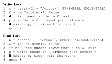 这个锁定过程与之前的锁略有不同。写锁仅在命名上有所不同。由于读锁可以共享,因此第3行和第4行略有不同,因为只有较早的写锁znode阻止客户端获取读锁。当有多个客户端等待读锁并在具有较低序列号的“write-”znode被删除时得到通知时,虽然看起来具有“惊群效应”;但是实际上,这是一种期望的行为,所有这些获取读锁的客户端都应该得到通知,因为读锁是可以被同时获取的。