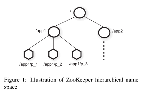 **数据模型(Data model)。**ZooKeeper的数据模型本质上是一个具有简化API和完整数据读写的文件系统,或者是一个具有分层键的键/值表。分层命名空间对于分配不同应用程序的命名空间的子树和设置对这些子树的访问权限非常有用。我们还利用客户端的目录概念构建更高级别的原语,如我们将在2.4节中看到。