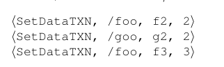 例如,假设在一个ZooKeeper数据树中,两个节点/foo和/goo的值分别为f1和g1,当模糊快照开始时,它们的版本都是1,然后接收到以下形式的状态更改流 ⟨transactionType, path, value, new-version⟩: