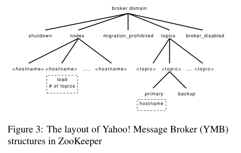 图3显示了YMB的部分znode数据布局。每个代理域都有一个名为nodes的znode,其中包含了组成YMB服务的活动服务器的临时znode。每个YMB服务器在nodes下创建一个临时znode,其中包含负载和状态信息,通过ZooKeeper提供群组成员和状态信息。诸如shutdown和migration prohibited之类的节点被所有组成服务的服务器监听,并允许对YMB进行集中控制。topics目录是YMB管理的每个主题对应的子节点。主题节点都有子节点,用于表示每个主题的主服务器和备份服务器,以及该主题的订阅者。主服务器和备份服务器的znode不仅允许服务器发现负责主题的服务器,还管理领导者选举和服务器崩溃。