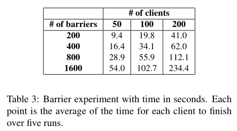 我们在表3中报告了我们的实验结果。在这个实验中,我们有50、100和200个客户端依次进入b个障碍,b 200*,* 400*,* 800*,* 1600。尽管一个应用程序可以有数千个ZooKeeper客户端,但很多时候,每个协调操作中参与的客户端数量要小得多,因为客户端通常根据应用程序的具体情况进行分组。